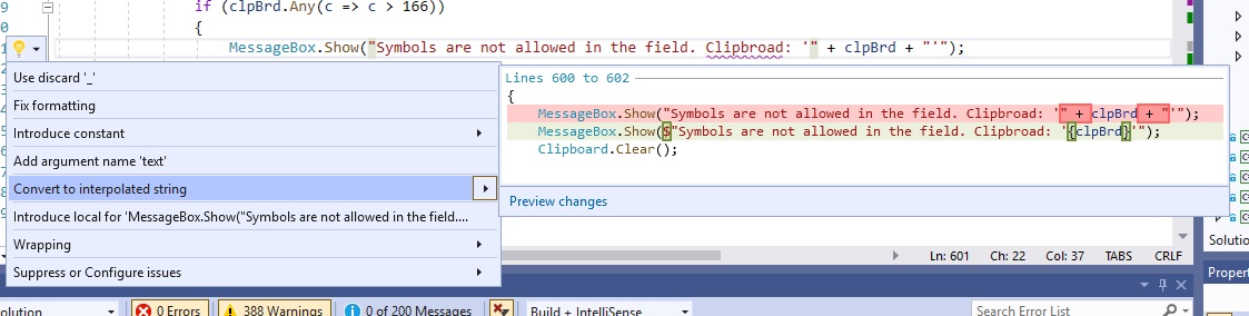 @@ -589,0 +598,4 @@string clpBrd = Clipboard.GetText();if (clpBrd.Any(c => c > 166)){MessageBox.Show("Symbols are not allowed in the field. Clipbroad: '" + clpBrd + "'");minor - Performance String Concatenation