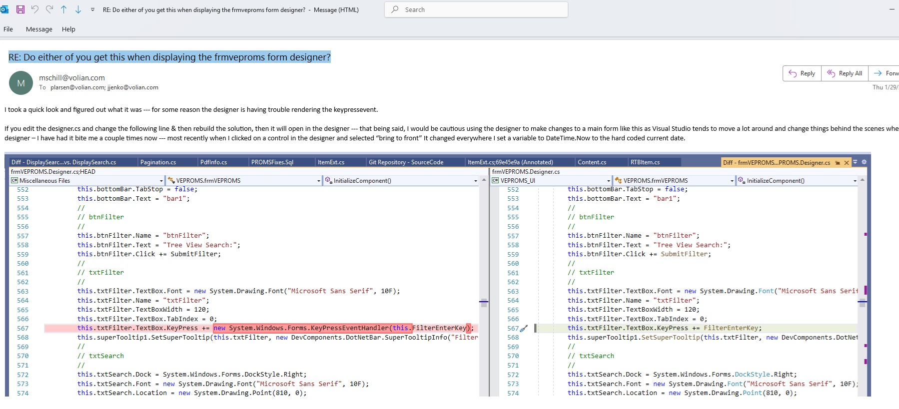 see email from mschill@volian.com from "Thu 1/29/2026 7:38 AM" titled "RE: Do either of you get this when displaying the frmveproms form designer?"